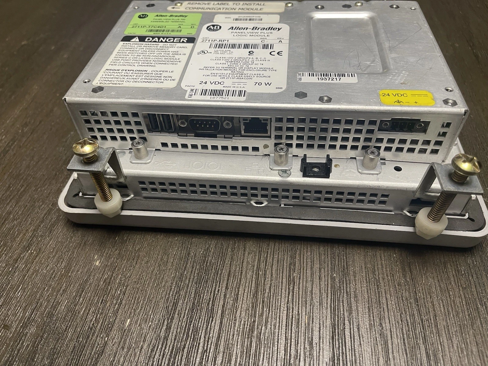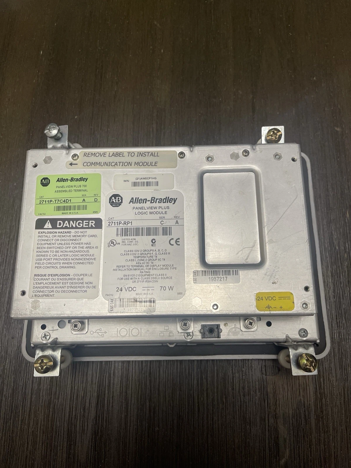 New Allen Bradley 2711P-T7C4D1 PanelView Plus 700 Series A 7″ color touchscreen with 2711P-RP1 module for industrial automation applications.
