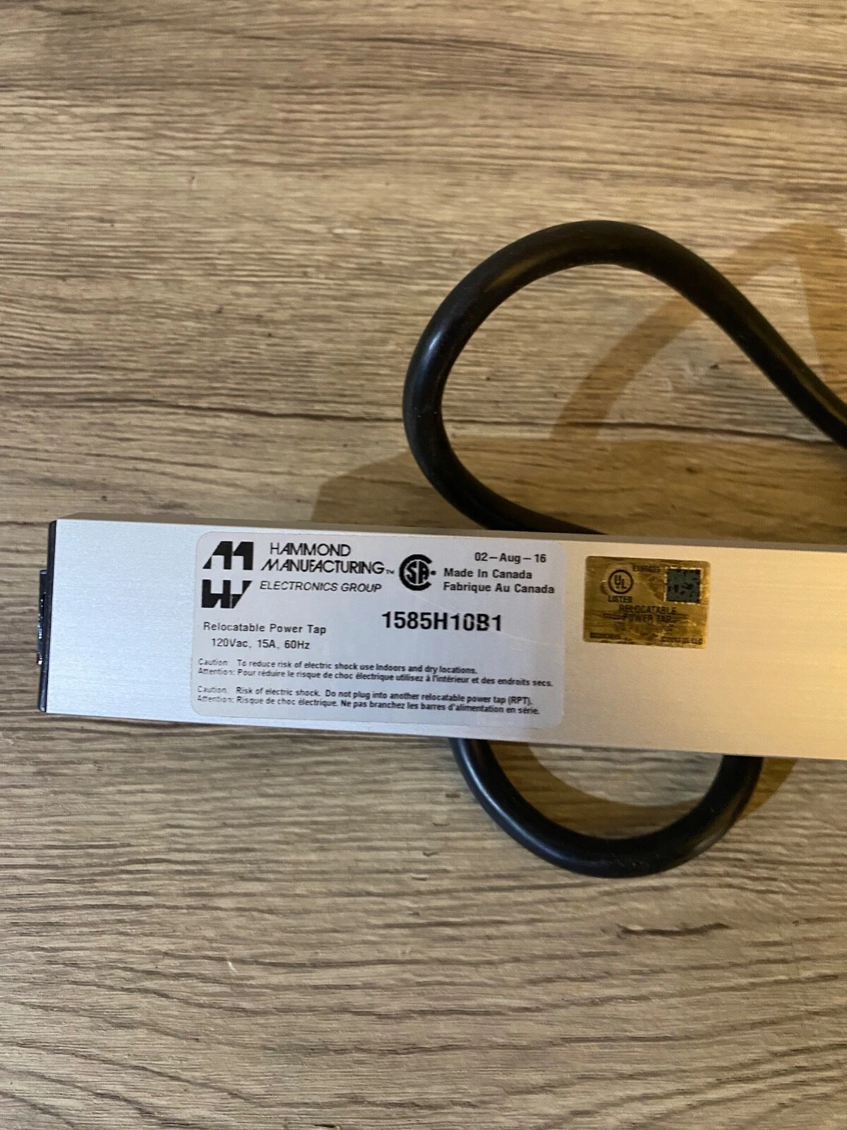 Hammond 1585H10B1 48″ vertical power strip, 10 outlets, 15A, with on/off switch, new, for office, lab, and industrial power distribution.