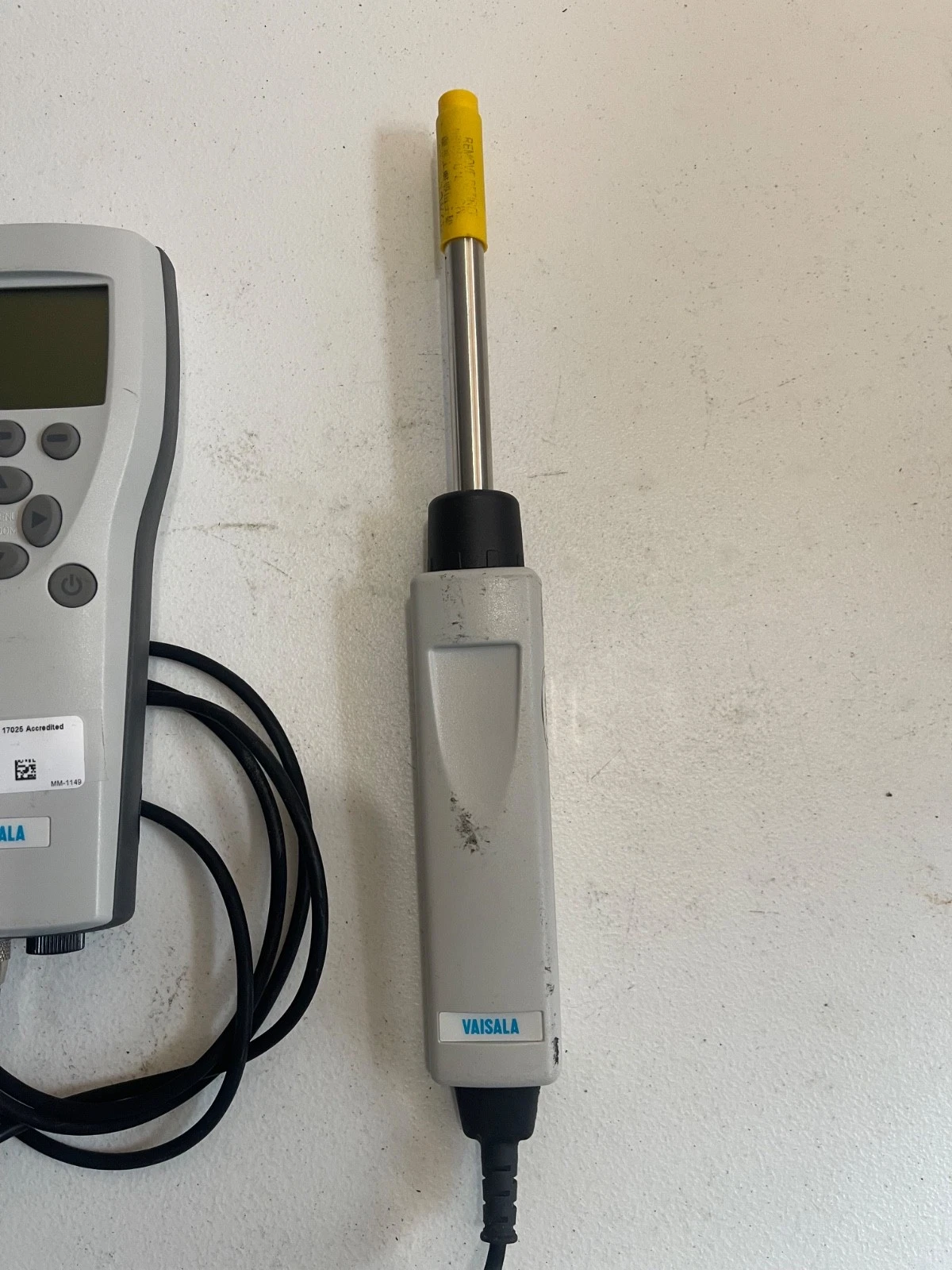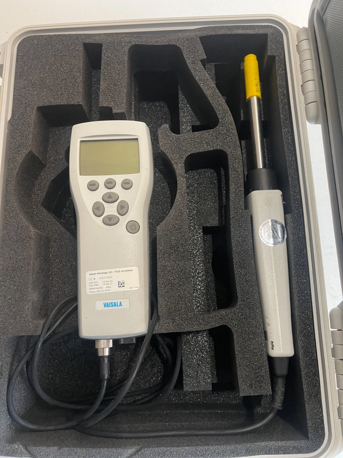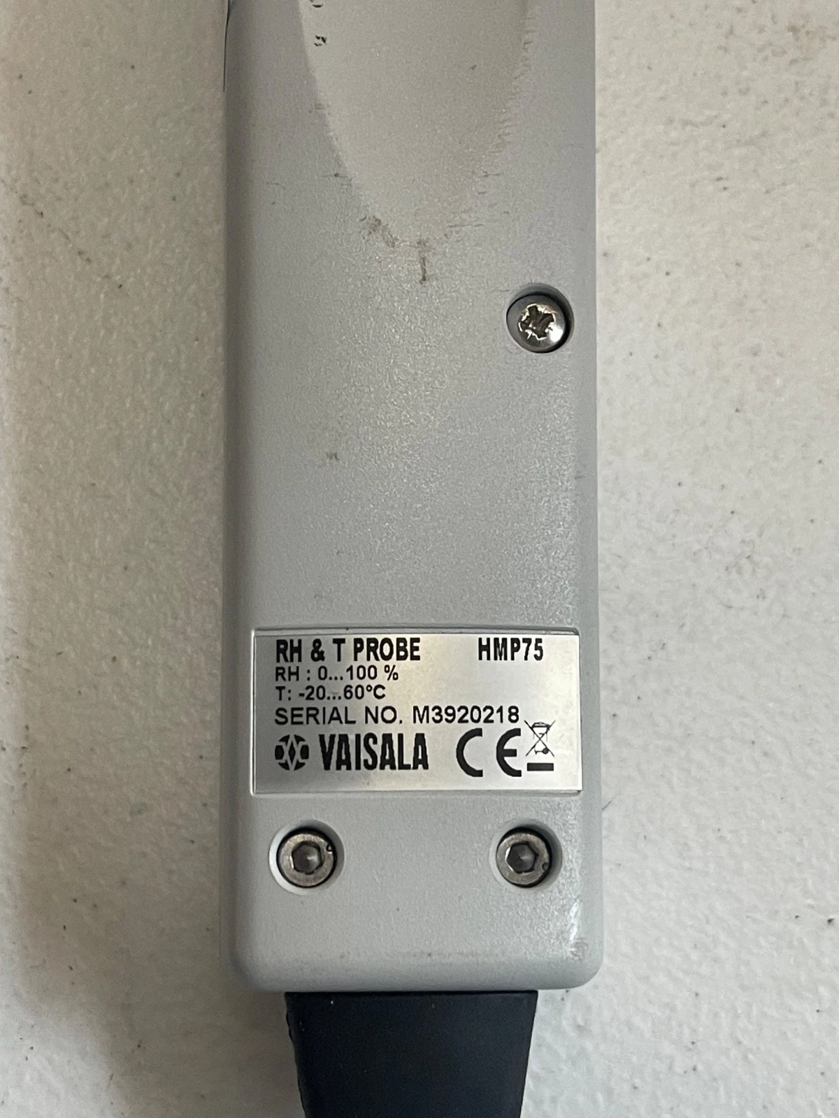 This listing is for a Vaisala MI70 Handheld Indicator paired with an HMP75 Relative Humidity & Temperature Probe. This portable instrument is designed for precise measurement and monitoring of humidity and temperature in laboratory, industrial, and environmental applications.