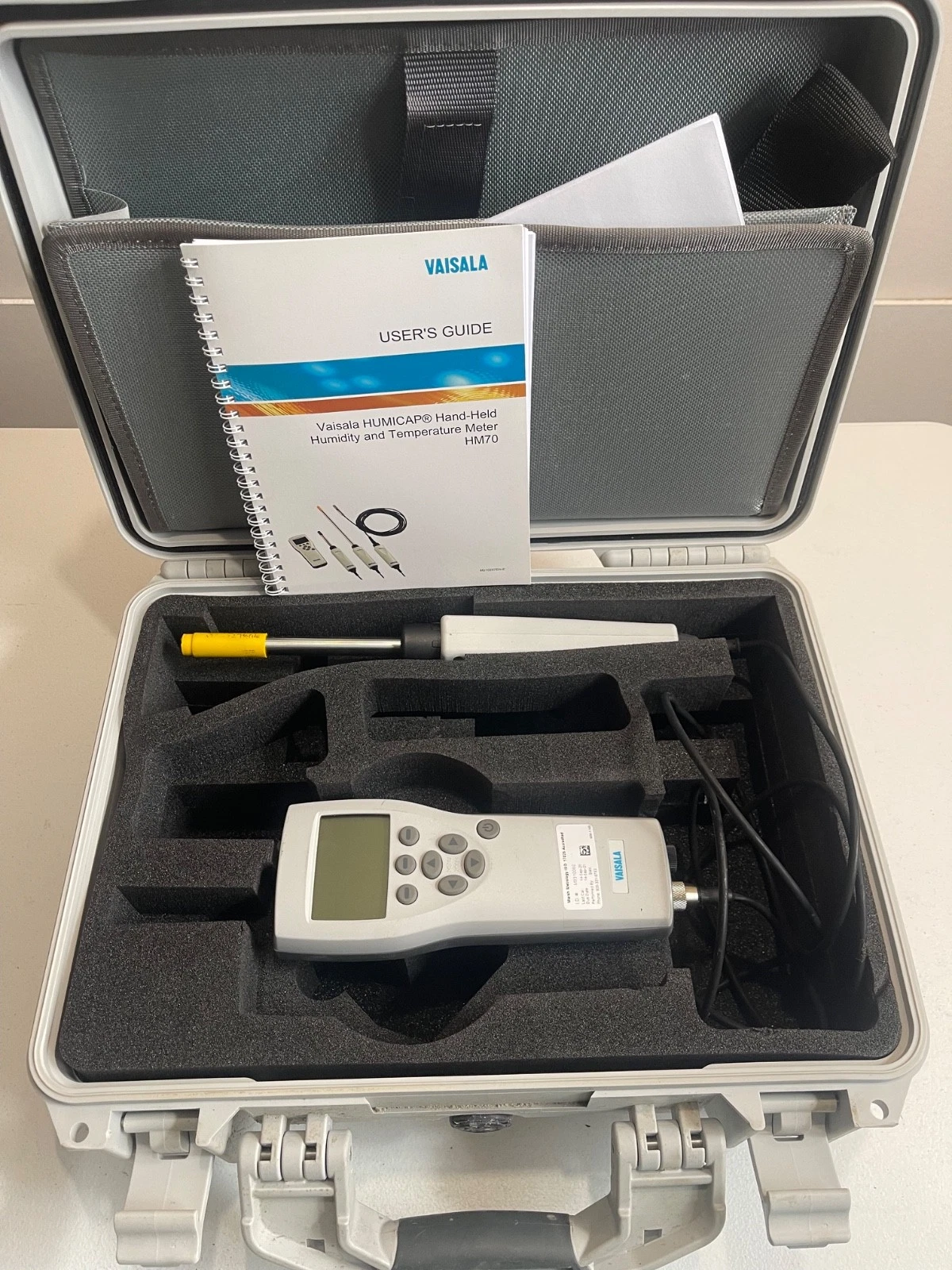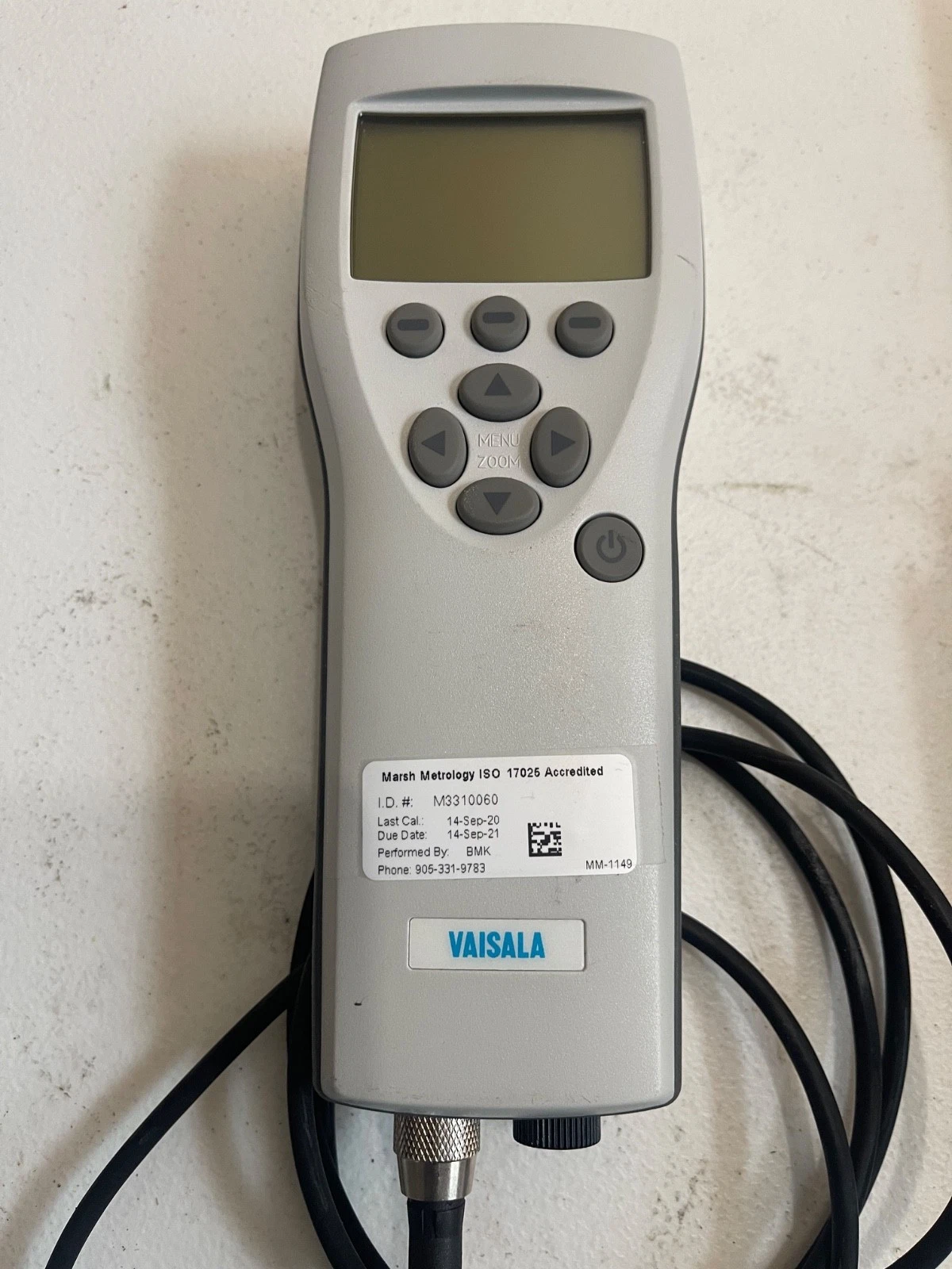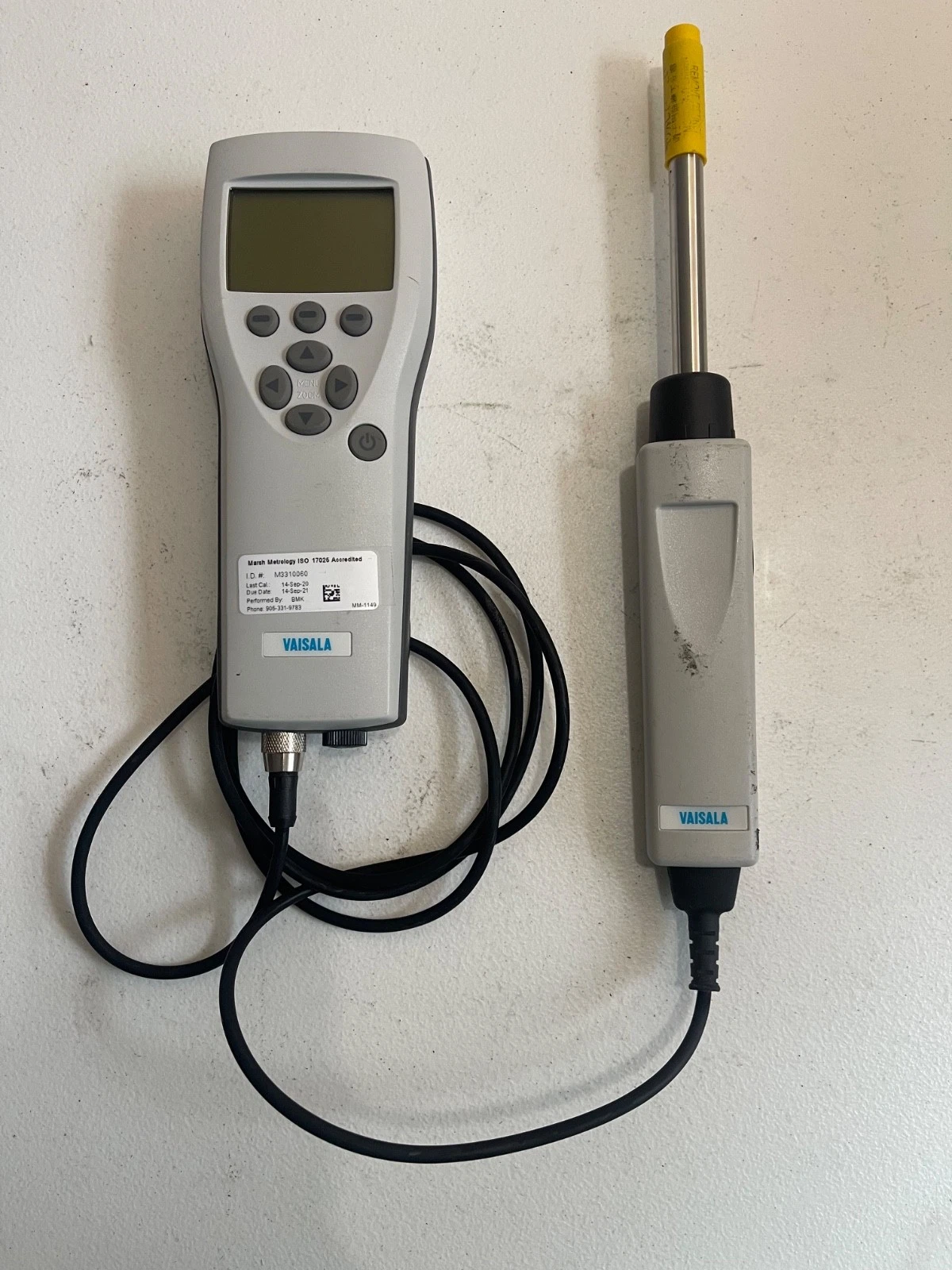 This listing is for a Vaisala MI70 Handheld Indicator paired with an HMP75 Relative Humidity & Temperature Probe. This portable instrument is designed for precise measurement and monitoring of humidity and temperature in laboratory, industrial, and environmental applications.